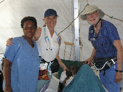 "The conditions in Port-au-Prince airfield include very hot days with temps in the 90’s but, cooler in the evenings, and very frequent to continuous loud jet and propeller aircraft noise. The air is extremely dusty so expect to be very dusty, sweaty and dirty. Your clothing should be lightweight clothing appropriate for a tropical environment. Scrub tops are usually worn for medical staff. Ideal footwear includes light hiking type boots, military boots or other shoes designed for rough outdoor terrain. The ground our hospital sits on is a mowed field with many rocks, and small stumps. The staff tent sleeps over 140 volunteers and cots are available for your use. Each cot is side by side with another cot and there is no gender separation. We have 4 outdoor showers that are modest and shared by both men and women. We do not always have water available. So expect that you may not have an opportunity to shower for periods of up to 2 days. You can always “shower” with bottle water or use wet wipes. Toilet facilities consist of Porta-potties. We do not have laundry facilities so consider enough clothing to for your length of stay. Some volunteers wash clothes in small buckets. Our food consists of military style Meals Ready to Eat commonly referred to as MRE’s. You are welcome to bring whatever you like but we do not have any refrigeration."