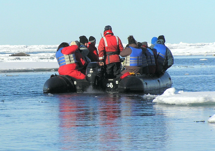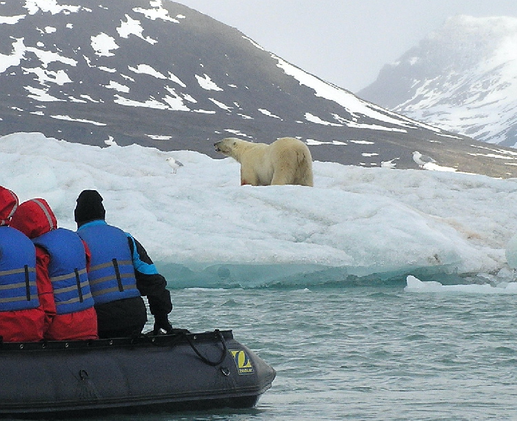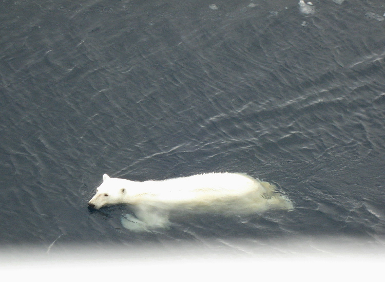 ![]() Cliffs, tundra & reindeeer at 14th of July Glacier & tundra site | ![]() Bearded seal, Zodiac & Vavilov | ![]() Polar bear swims & watches Zodiacs at 14th July glacier |