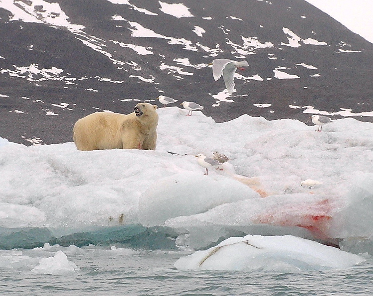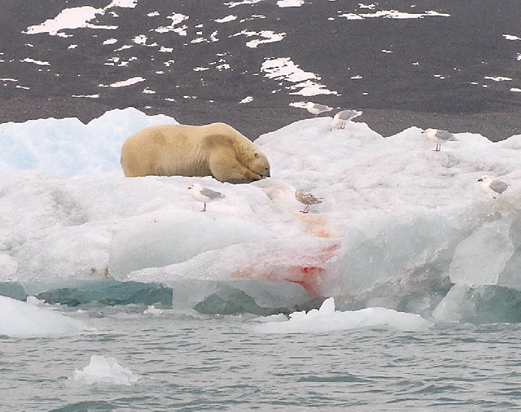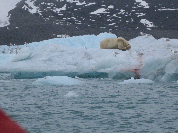 ![]() Bear feeding on seal | ![]() Filling up before winter | ![]() On iceberg in front of Monaco glacier. Great site for breakfast |