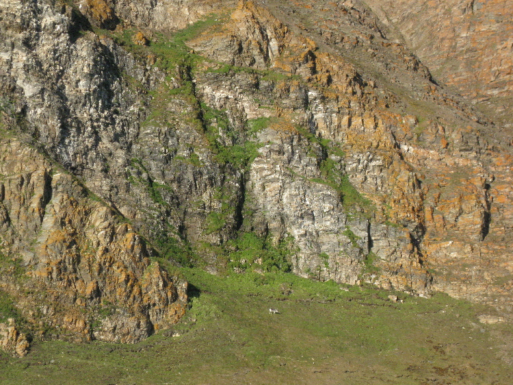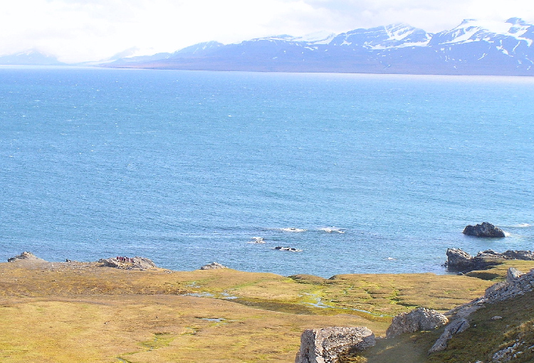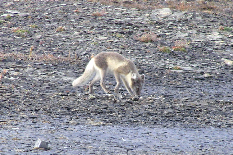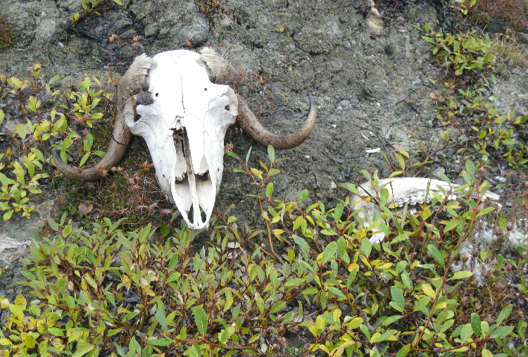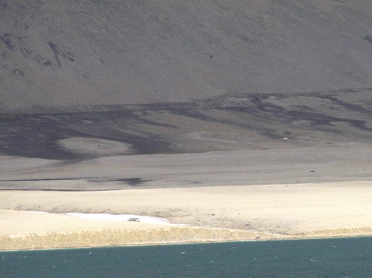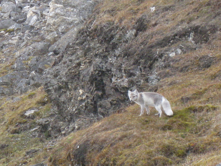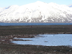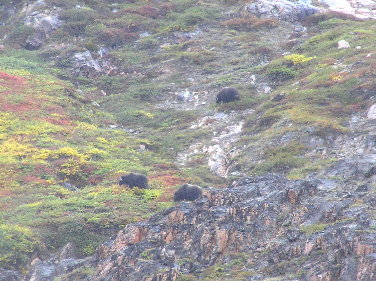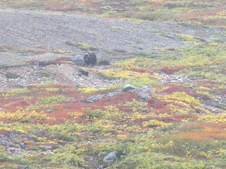 ![]() The lush (compared to Spitsbergen) tundra at Rypefjorden-willows up to 12", blueberries | ![]() Looking back toward inlet | ![]() Distant, wary musk ox |