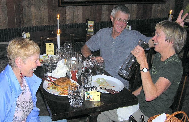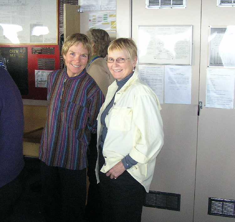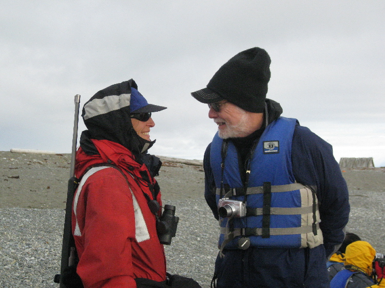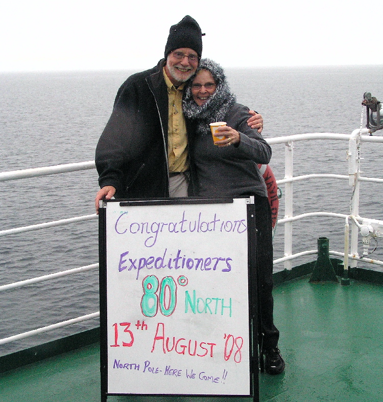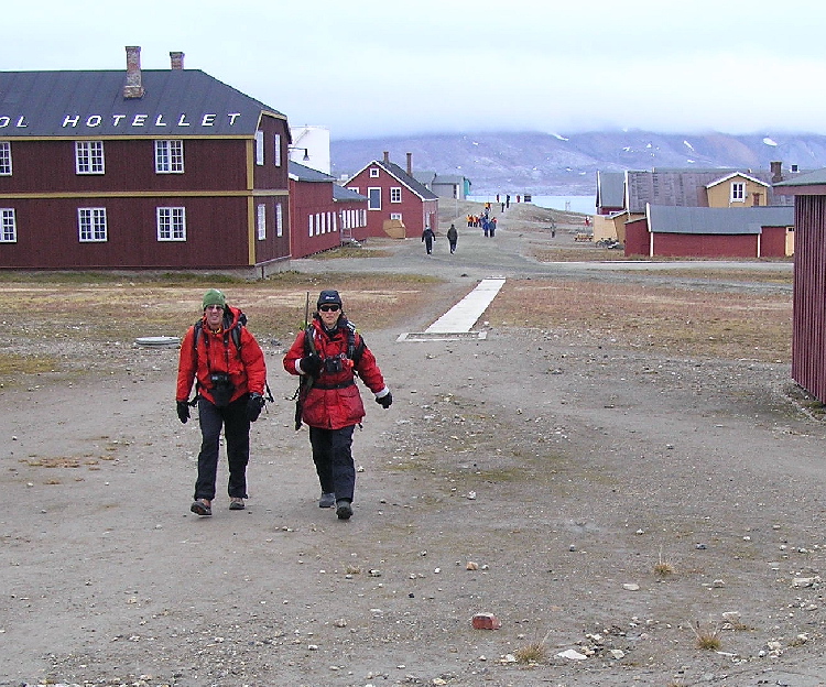 Longyearbyen and spent the day in town while the ship was made ready for our 2nd cruise and a new group of passingers. | ![]() Mike & Annie marching with purpose-NyAlesund 8/19/08 | ![]() Mike & Nan with Lynn at helm birding at 14th July glacier |