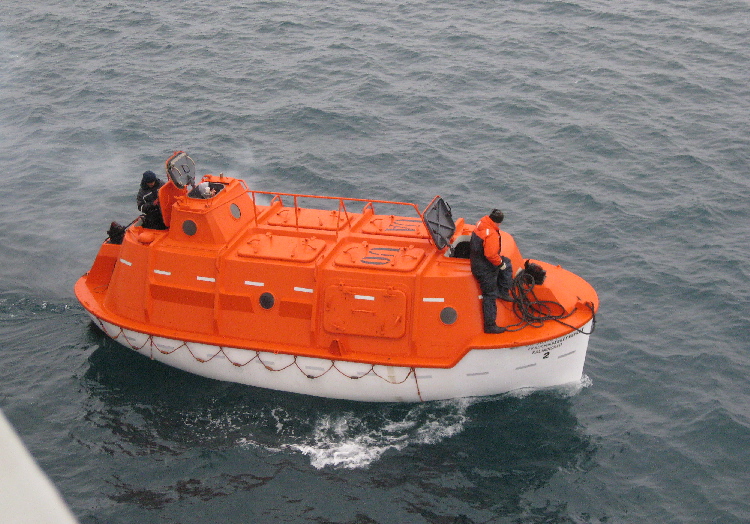 ![]() Approching Greenland at Scorsbysund | ![]() 1st landing Greenland. Fresh snow and calm inlets | ![]() Test of arctic waters lifeboats - after the big storm . . . |