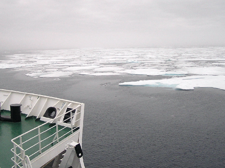 ![]() Returning from 8/14 landing | ![]() Mike, Nan & "Chargers". We sure look small in this big country | ![]() Cruising sea ice 8/15/08 |
