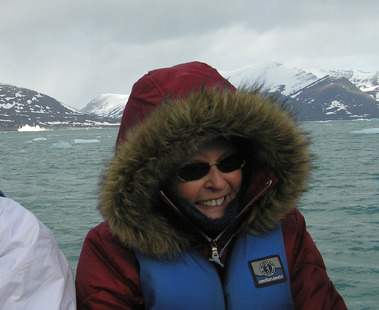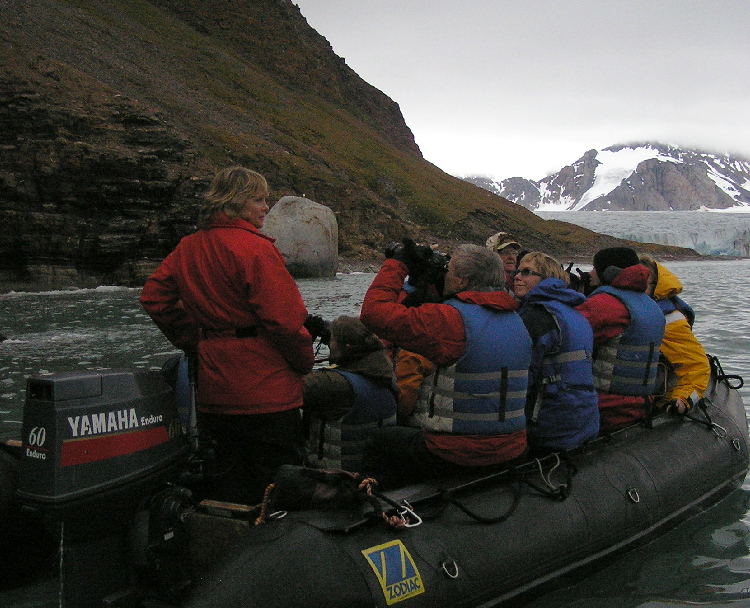 ![]() Our 1st look at Northern Spitsbergen 8/9/08 | ![]() Nan & Mike on board for 1st Zodiac excursion - Annie is the Captain | ![]() Zodiac view of Hansbeen Glacier |
