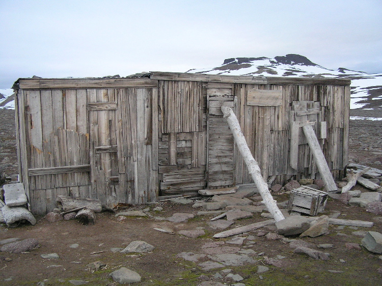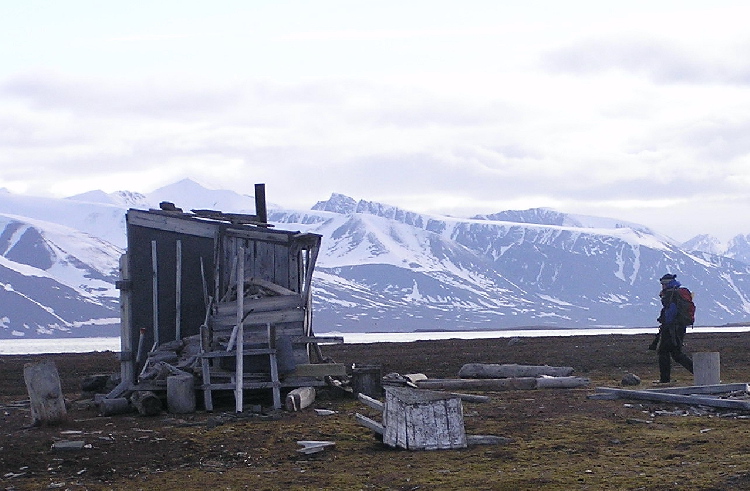 ![]() Bear print at Worsleyneset 2nd outing, 1st landing today | ![]() Dutch checks hunting cabin before we get closer | ![]() Worsley Beacon from 1925 expedition |