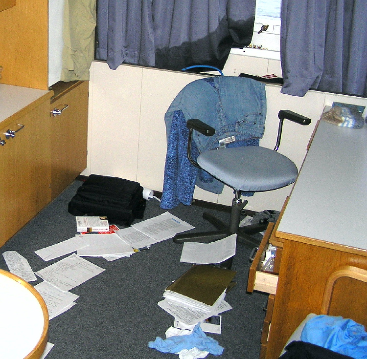 Greenland Sea, toward Greenland. Time for lectures, reading & visiting and seeing our 1st sunset in 16 days! | 8/24 the Vavilov was buffeted by hurricane force winds at 72 knots and 23 foot waves. Woke us up and tossed us around | ![]() Part of our cabin after the storm 8/24/08 |