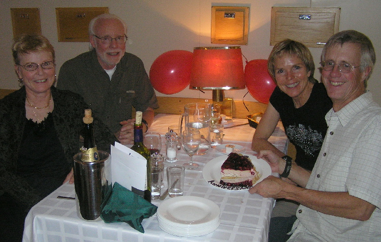 ![]() Leaving the "S" curve port of Heimaey | ![]() Johnson's 39th wedding anniversary (photo fuzzy - Mike & Nan were clear!) | ![]() Mike & Nan bid farewell to dining staff Alexey & Sasha (Another fuzzy, sorry) |