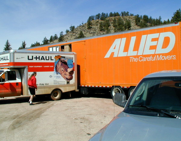 |  ART, RYAN & WAYNE UNLOAD FURNITURE. MICHAL CHECKS THE LIST 4/14/04