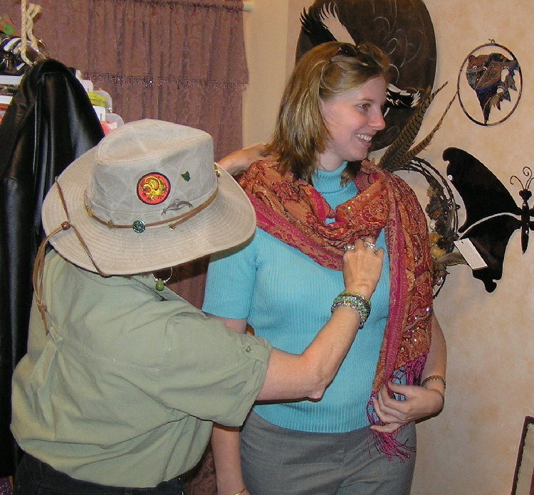 Michal helps Leah try on scarf at Cripple Creek 10/1/06